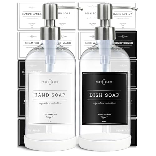 Vine Creations Clear Glass Soap Dispenser, 2 Pack Kitchen Soap Dispenser Set with Stainless Steel Pump, 16 oz Hand Soap or Dish Soap for Bathroom or Kitchen with Waterproof Labels