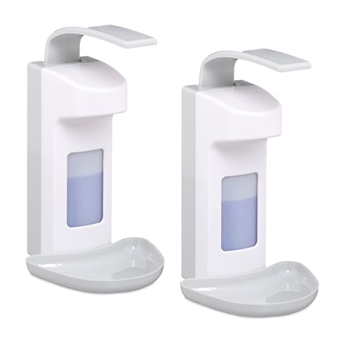 Relaxdays Soap Dispenser, Set of 2, 500 ml, Drip Tray, Lever, Sanitiser Container, Wall-Mount, Hygienic, White/Grey, 29 x 16 x 18 cm