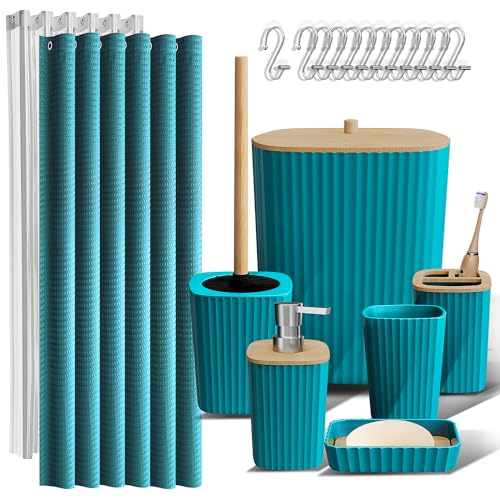 Clara Clark Bathroom Accessories Set - Bathroom Accessory Set with Shower Curtain Set, Toilet Brush, Trash Can & Soap Dispenser (Teal, Complete Set)