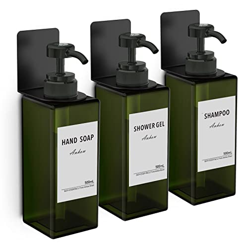 Anhow 3PCS Soap Dispenser Set 500 ml | Wall Mounted Shampoo and Conditioner Dispenser | Wall Without Drilling Plastic Shower Pump Dispenser with Waterproof Labels for Kitchen and Bathroom (Green)