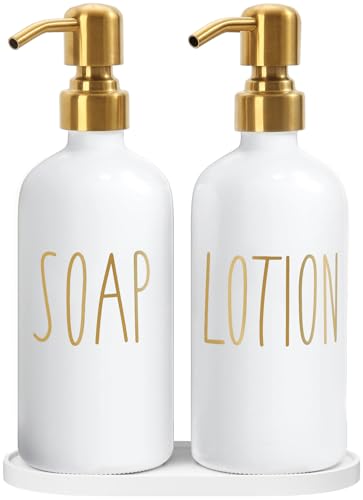 Luxury Glass Soap and Lotion Dispenser Set with Tray by Brighter Barns - Hand Soap Dispenser Bathroom Set & Stainless Steel Pump for Home or Airbnb - White and Gold Bathroom Accessories & Decor (Gold)