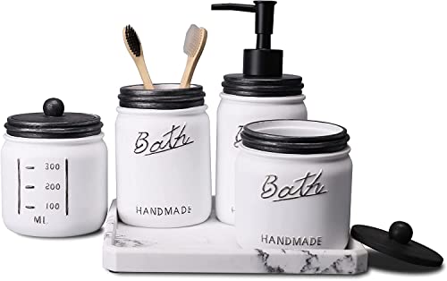 LKKL Mason Jar Bathroom Accessories - 5PCS Soap and Lotion Dispenser Set 2 Apothecary Jars, 1 Toothbrush Holder, 1 Soap Dispenser, 1 Bathroom Tray (Black/White)