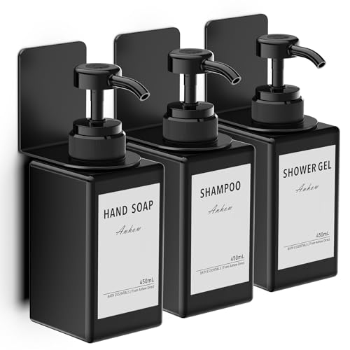 Anhow 3PCS Soap Dispenser Set 450 ml | Wall Mounted Shampoo and Conditioner Dispenser | Wall Without Drilling Plastic Shower Pump Dispenser with Waterproof Labels for Kitchen and Bathroom (Black)