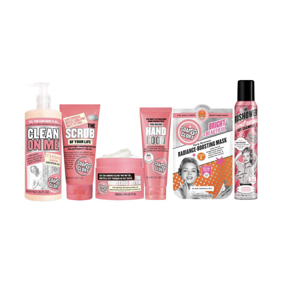 Soap & Glory The Glorious Five Gift Set - Righteous Butter Body Butter Clean On Me Shower Gel Flake Away Body Scrub Vitamin C Face Wash & Pillow P