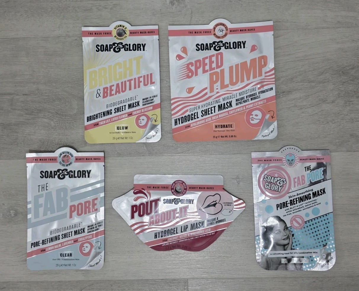 5 x SOAP & GLORY - FACE SHEET MASK BUNDLE - BRIGHT & BEAUTIFUL - THE FAB PORE