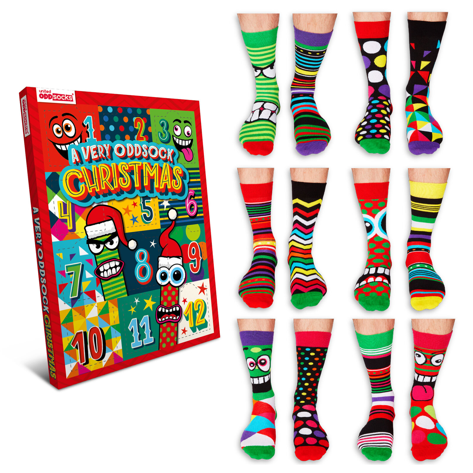 United Oddsocks A Very Oddsock Christmas Advent Calendar – 12 Individual Festive Odd Socks for Women, Mix and Match Novelty Holiday Sock Box with Colourful Designs UK 4–8, EUR 37–42, US 6.5–10.5