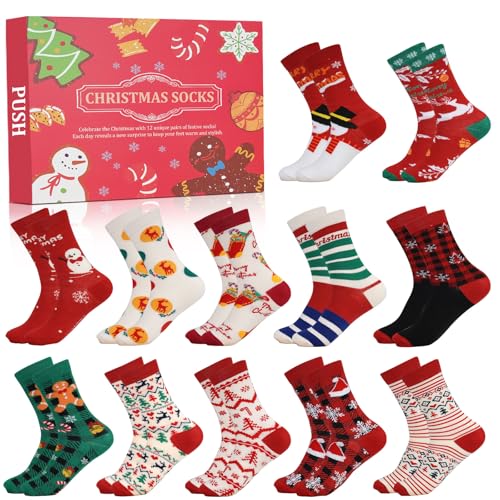 ANOTION 2025 Christmas Advent Calendar - 12 Days of Warm Socks for Women, Holiday Countdown Calendar Gifts, 12 Pairs With Christmas Tree, Elk, Snowman Patterns