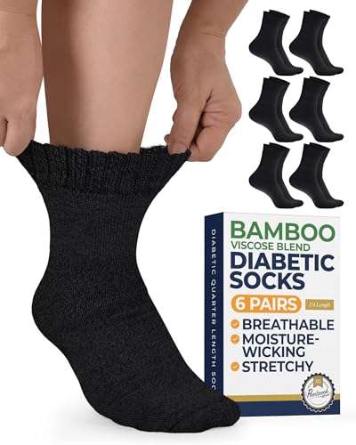 Pembrook Bamboo Viscose Diabetic Socks for Women & Men - 6 Pairs Ankle Socks for Swollen Feet | Neuropathy Socks | Ankle Neuropathy Socks for Men | Stretch Top Mens Diabetic Socks | Black