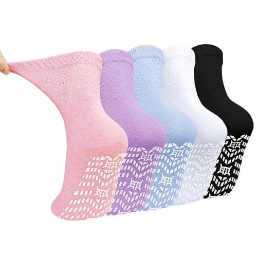 PUTUO Non Slip Socks for Women: Non Elastic Calf Socks with Grips for Swollen Feet & Legs Anti Slip Cotton Socks for Women Grippy Socks Multicoloured 5 Pairs 5.5-7.5