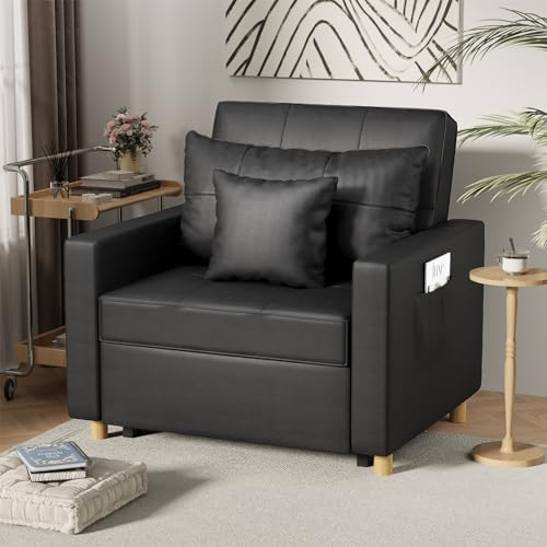 Esright Small Sofa Bed Chair, Folding Chair Bed for Small Room, 3-in-1 Convertible Sleeper Chair with Side Pocket, Single Sofa Bed and Armchair Bed for Living Room, Leather Black