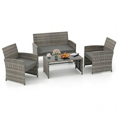 RELAX4LIFE 4PCS Rattan Garden Furniture Set, All-Weather Conversation Set with Glass Tabletop and Removable Cushions, Wicker Sofa Chair and Table Set for Backyard (Grey, Loveseat-107x63x78cm)