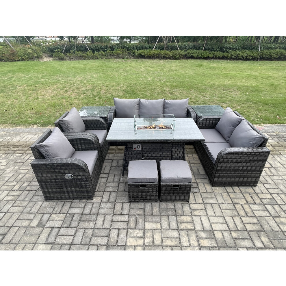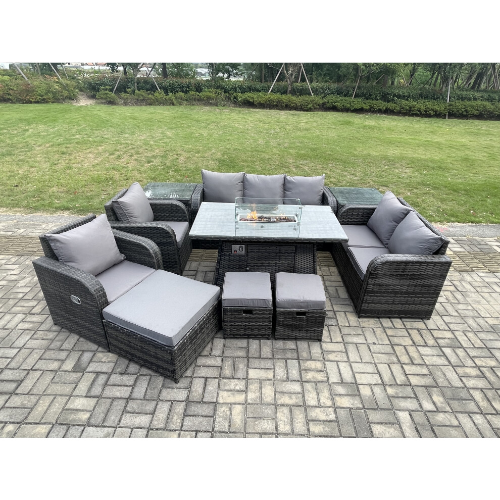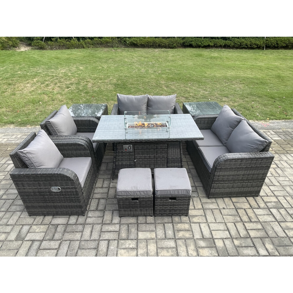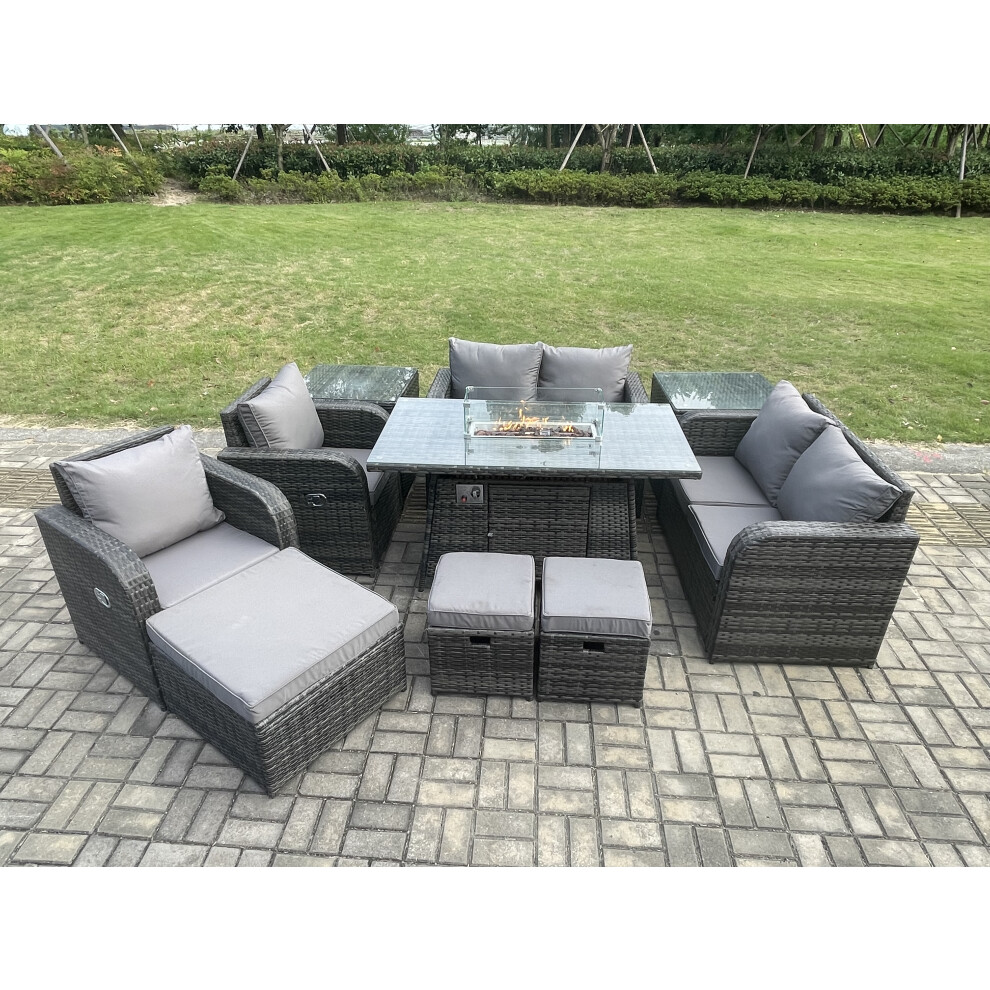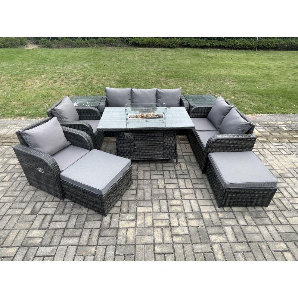 Fimous 9 Seater Outdoor Rattan Garden Furniture Set Propane Gas Fire Pit Table and Sofa Chair set with Side Table 2 Big Footstool