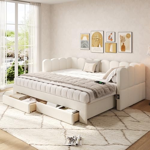 Merax 3ft Upholstered Daybed Extendable Sofa Bed Pull-out Bed,USB Ports and Storage Drawers - 90x190 cm, Extendable to 180 cm,Beige Chenille Fabric