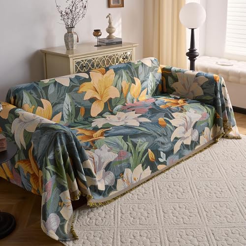 Highdi Sofa Throws Large, Extra Large Throws for Settees Reversible Versatile Chic Woven Soft Throw Blanket with Tassels for Settees Couch Sofa Bed and Armchair (180x420cm,Lilies)