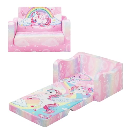 alldomess Comfy Kids Sofa Bed, 2-In-1 Foldable Toddler Chair Bed For Girls Boys, Convertible Sofa To Lounger Single Sofa Bed Chair For Kids Bedroom Playroom Nursery,Unicorn Rainbow
