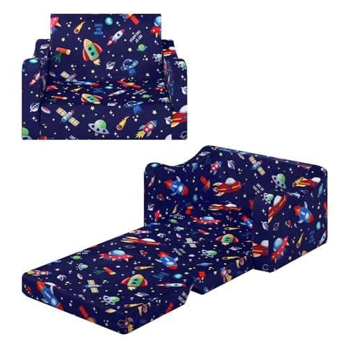 alldomess Comfy Kids Sofa Bed, 2-In-1 Foldable Toddler Chair Bed For Girls Boys, Convertible Sofa To Lounger Single Sofa Bed Chair For Kids Bedroom Playroom Nursery,Rockets