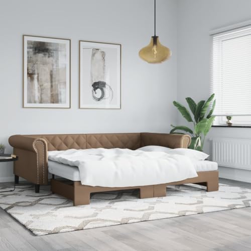 Teenpull Extendable Day Bed with Mattresses, 2-in-1 Sofa Bed, Brown Faux Leather, 90 x 200 cm, Sturdy Wood Metal Frame, Modern Design, Space-Saving for Guest Room
