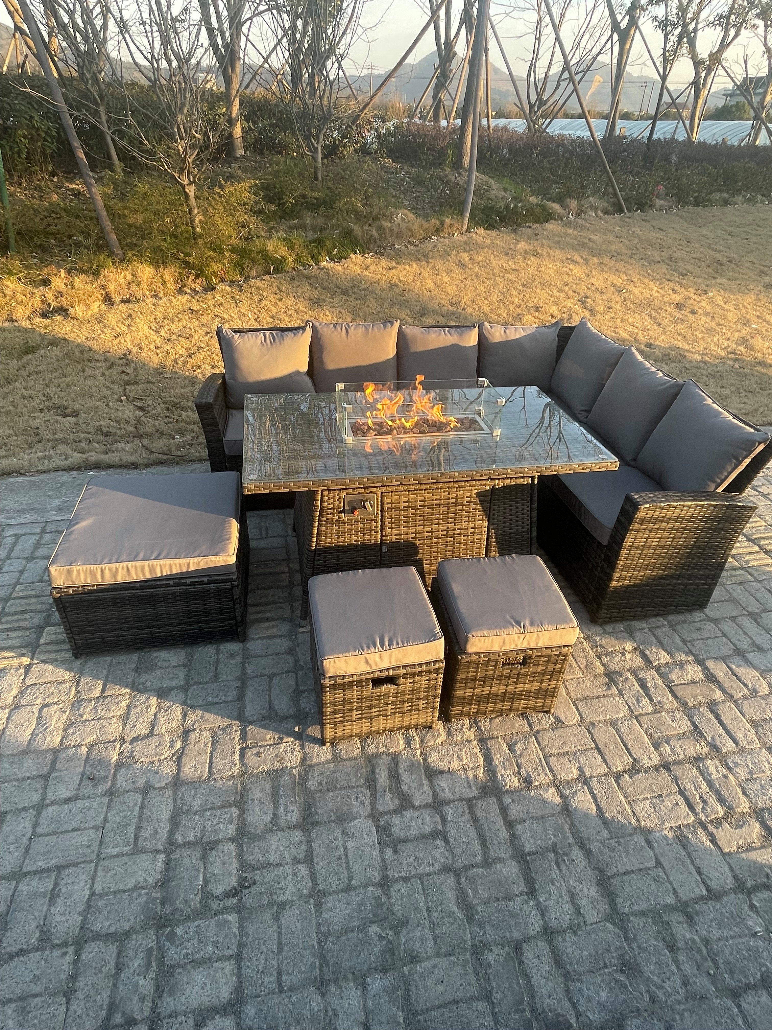 High Back Rattan Garden Furniture Sets Gas Fire Pit Dining Table Left Corner Sofa Small Footstools Chair 9 Seater