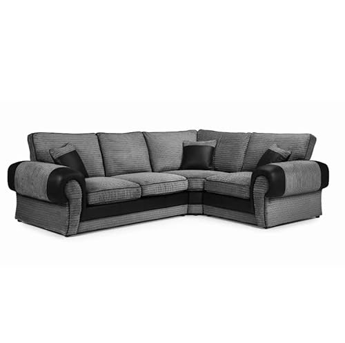 Grey Fabric & Black Faux Leather 3+2 Corner Armchair Seater Sofa Set | Modern High Back Cushioned Sofas | Deep Seat Comfort Living Room Suite | UK Home (Left Hand Corner)