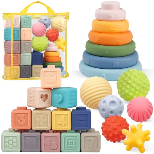 Plunack 24 Pack Montessori Toys for Babies, Soft Building Blocks for Baby, Sensory Teethers Toy Educational Squeeze Play Stacking Toys Gifts for Baby Boys Girls 6 9 12 Months 1 2 3 Year Old