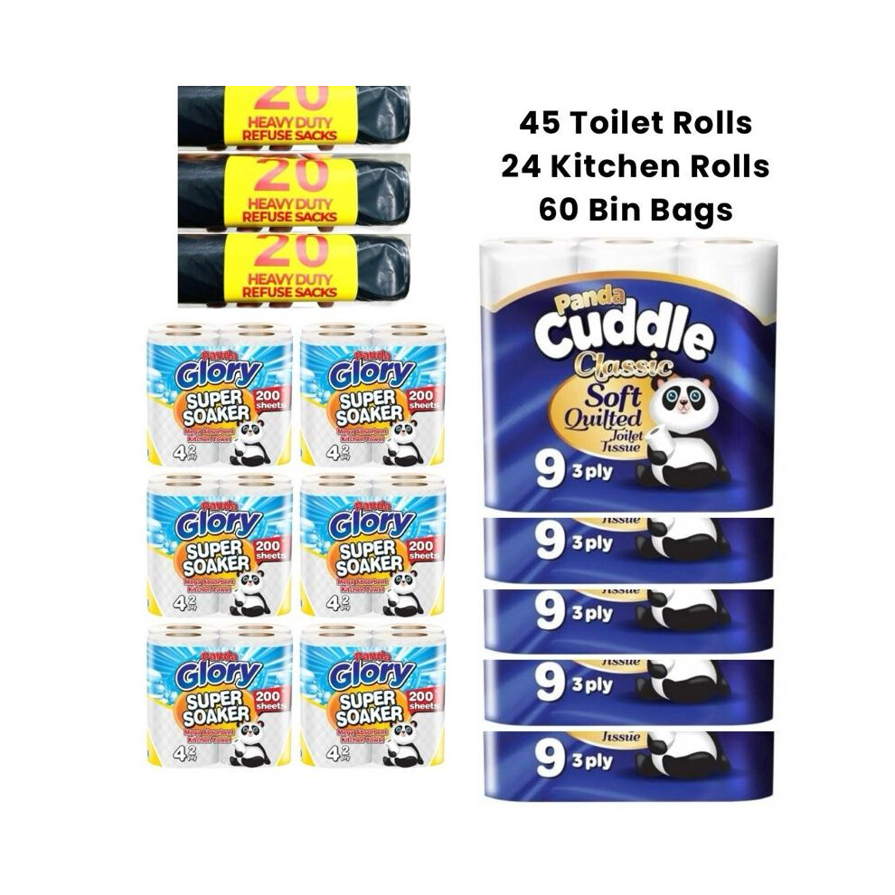 (Default) 45x Toilet Roll 3ply, 24x Kitchen Roll, 60xBin Bag Bundle - Luxury Quilted, Soft & Gentle, Flushable, Eco-Friendly, Disposable, Sustainable
