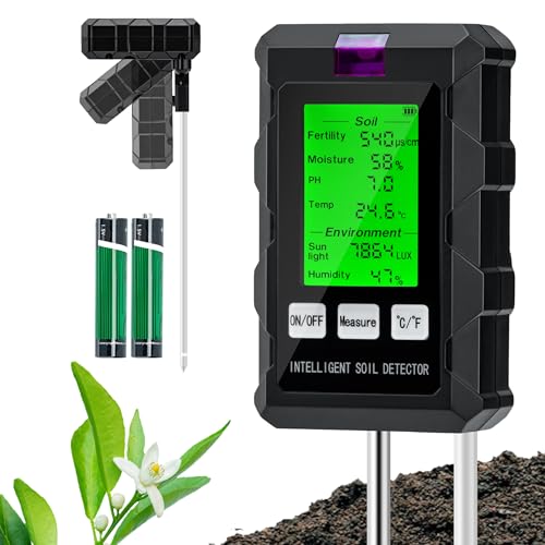 TRJZWA 5-in-1 Soil Moisture Meter, Fertility/PH/Soil Moisture/Temperature/Sunlight Intensity Soil pH Tester with Backlit LCD Display Plant Soil Test Kit for Gardens, Lawns, Yards and Farms