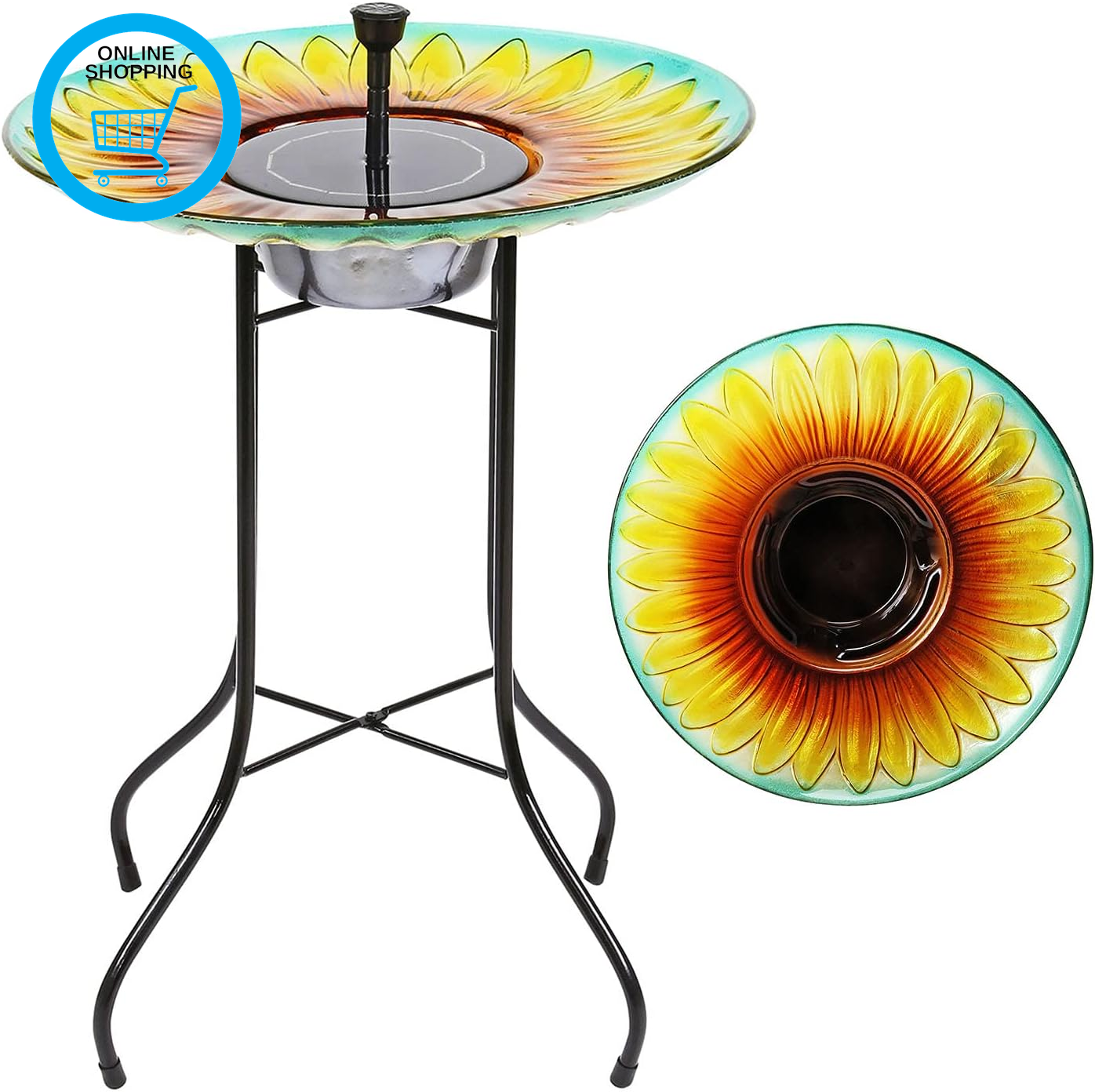 Solar Powered Glass Bird Bath Fountain Pond Décor Metal Stand Hand Painted Sunfl