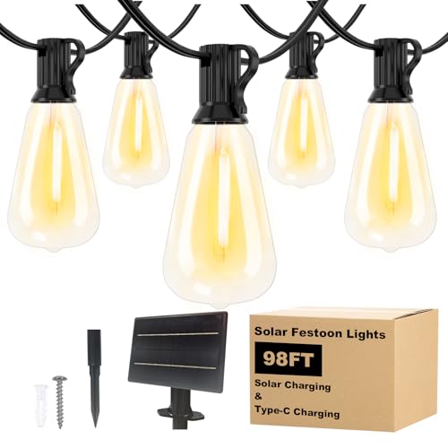 Spacelumen 30M Outdoor Festoon Lights Solar Powered, Outside Patio String with 3 Modes & 37+1 ST38 Edison Bulbs Shatterproof, Solar String Lights Outdoor Garden for Outside Garden Backyard
