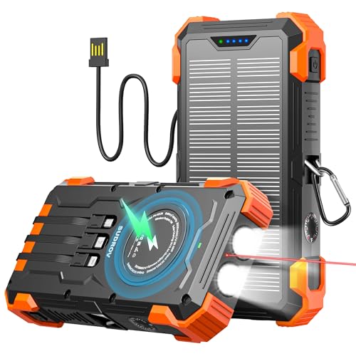 Solar Power Bank 26800mAh with 4 Built-in Cables, Portable Solar Charger with Fast Charging USB-C, Wireless Power Bank with Dual LED Flashlights, for Mobile Phones, Tablets & Camping (Orange)