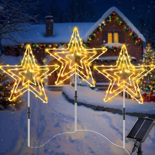 Joycome Solar Christmas Lights Outdoor 3x75 LED Star Christmas Pathway Lights, IP65 Waterproof Xmas Star Stake Light Solar Powered, 8 Modes Stake Light for Path Yard Garden Xmas Decorations