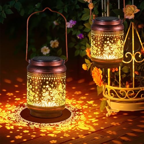 BUCASA 2 Pack Birthday Gifts for Women, Garden Ornaments Outdoor Butterfly Solar Lanterns for Outside, Waterproof Hanging Garden Solar Lights Christmas Gifts Presents Mothers Day Gifts for Mum Grandma