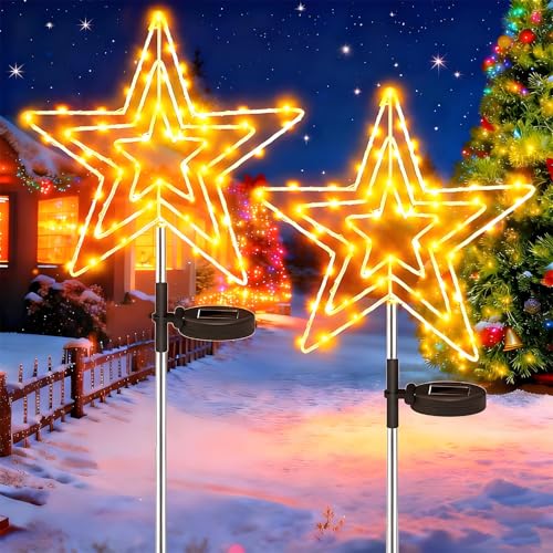 Joycome Solar Christmas Lights Outdoor 2 Pack 75 LED Star Christmas Pathway Lights, IP65 Waterproof Xmas Star Stake Light Solar Powered, 8 Modes Stake Light for Path Yard Garden Xmas Decorations