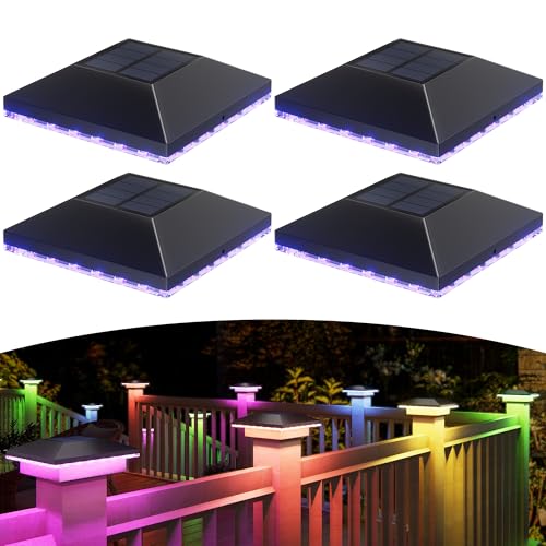 JACKYLED Solar Post Lights RGB—IP54 Waterproof LED Deck SolarFence Lights, Fits 4x4 to 5x5 Posts (7.3–10.5cm), Auto On/Off, 800mAh, Dusk to Dawn Multi-Colour Lighting for Yard, Patio, Garden,4 Pack