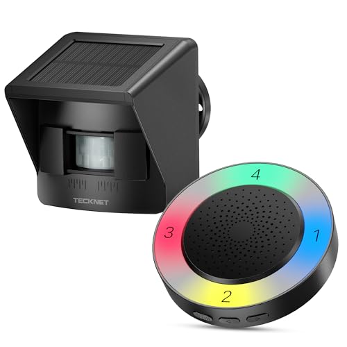 TECKNET Solar Wireless Driveway Alarm with 2600FT Long Range & 36 Melodies & 5 Volumes and Supports 4 Zones Weatherproof Motion Sensor Alarm to Protect Inside/Outside Property (1 Receiver 1 Sensor)