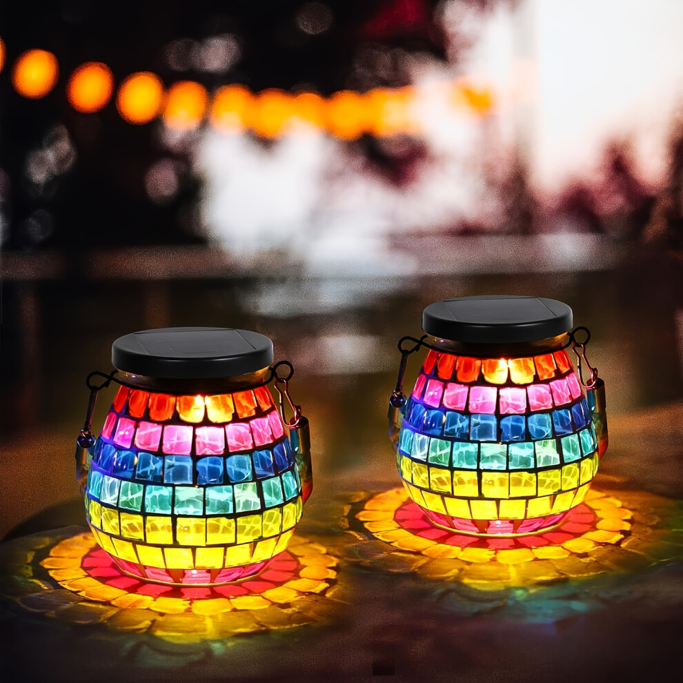 (2pcs) 2 pack Solar Mason Jar Lamp, Mosaic Hanging Pendant Light Enhanced Solar Panel Upgraded