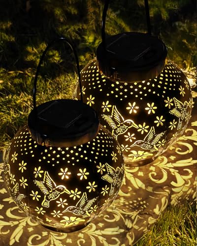 Joysing Hummingbird Solar Lanterns for The Garden 2 Pack Solar Garden Lantern, Hummingbird Gifts for Women, Metal Hanging Lights Waterproof Outdoor Lanterns for Yard Path Fence Decorations