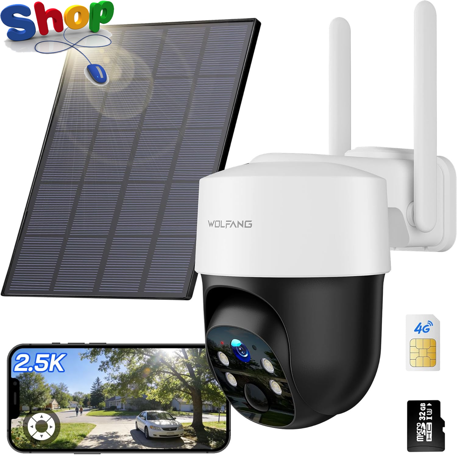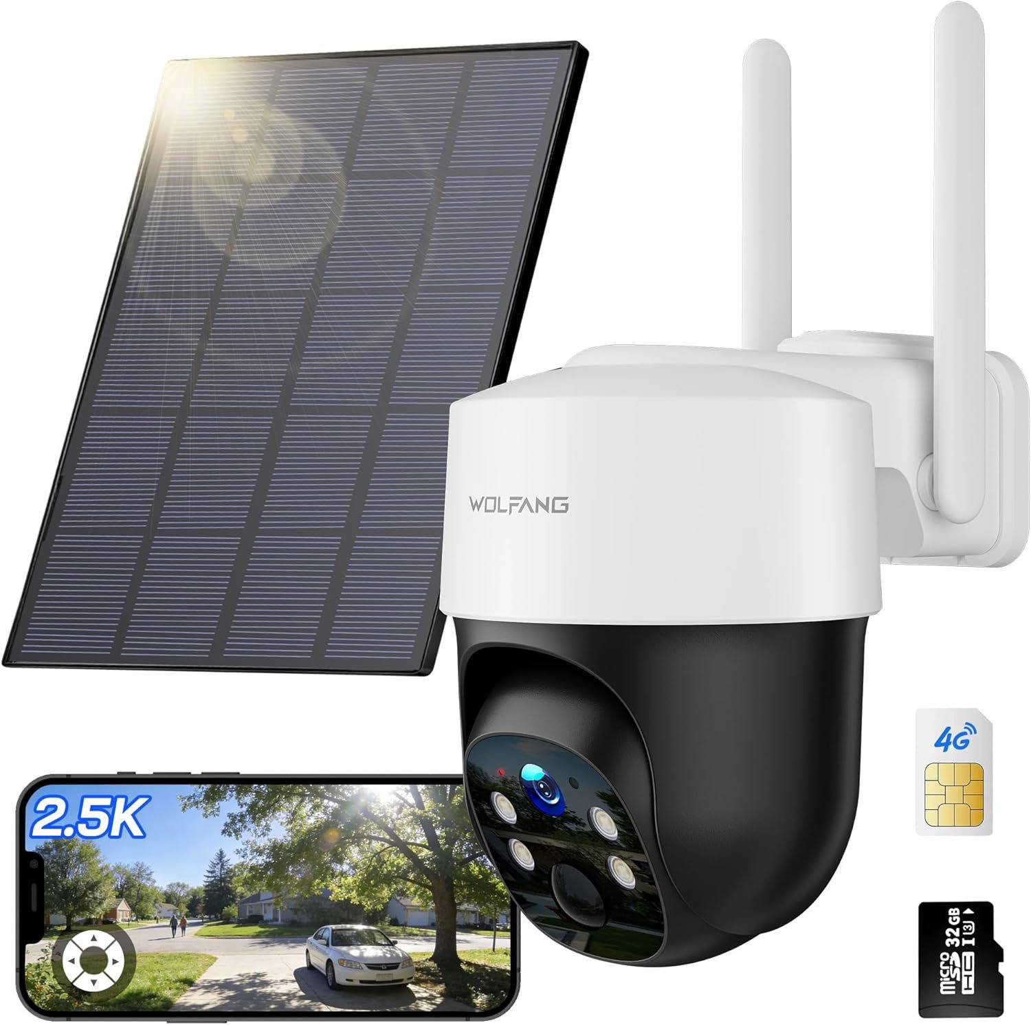 WOLFANG 4G Security Camera, Solar Powered CCTV with SIM Card, Camera Wireless Outdoor, No WiFi Needed, Night Vision, 2.5K, Local Recording, 2-Way Audio, PIR Motion, 32GB SD Card Included