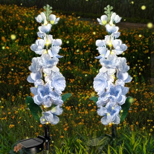 Solar Lights Outdoor, 2 Pack Upgraded Delphinium Solar Garden Lights,Waterproof Outdoor Light Solar Powered,Flower Garden Ornaments for Yard Lawn Patio Porch Pathway Cemetery Decorations (Blue)