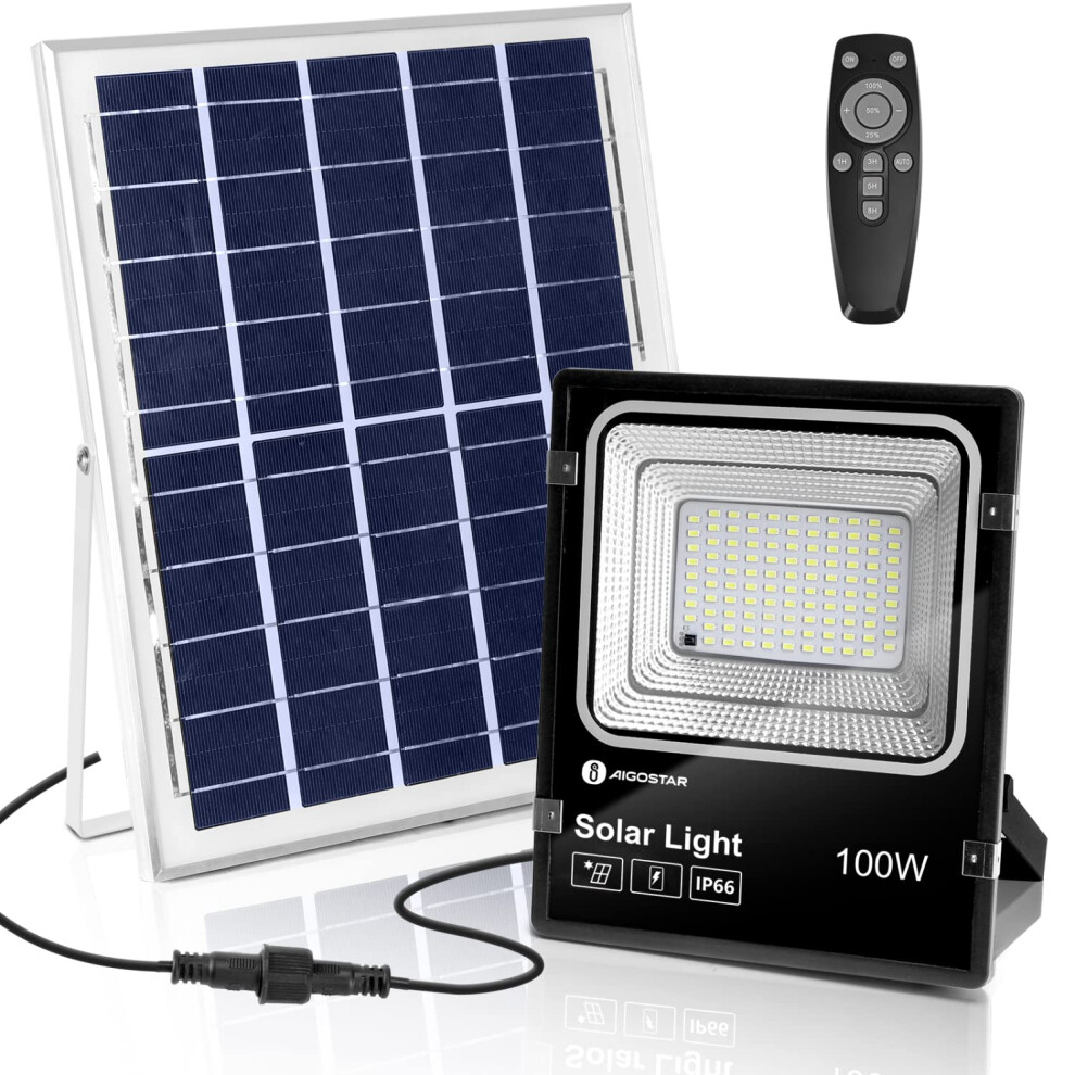 Aigostar 100W Solar Floodlight, Outdoor Floodlight with Soloar Panel 13.78"X11.42", IP66 Waterproof Super Bright Solar Powered Shed Light, Dimmable