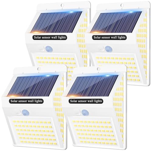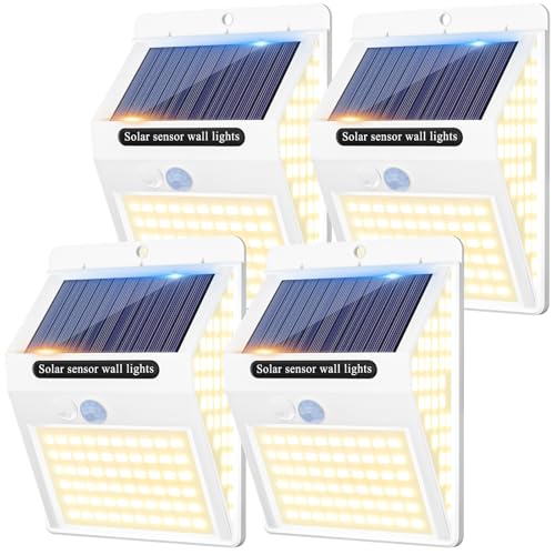 [4 Pack] 140LED Solar Security Lights Outdoor, Solar Motion Sensor Lights 270ºWide Angle Waterproof Solar Powered Durable Wall Lights Outside 3 Modes for Garden Fence Door Yard Pathway ,Warm White