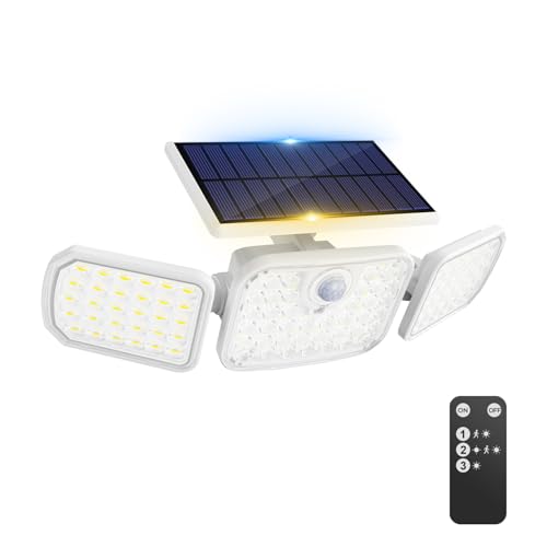 Peasur Solar Security Lights Outdoor Motion Sensor White Frame with 3 Modes, Solar Powered Flood Light with Remote Control 3 Adjustable Heads, IP65 Waterproof Wall Mount Wireless for Yard Garage