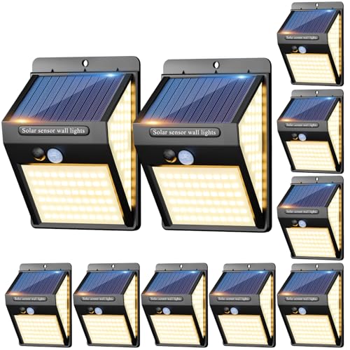 10 Pack 140LED Solar Security Lights Outdoor, Solar Motion Sensor Lights 270ºWide Angle Waterproof Solar Powered Wall Lights Outside 3 Modes for Garden Fence Door Yard Garage Pathway, Warm White