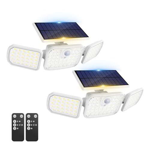 Peasur Solar Security Lights Outdoor Motion Sensor White Frame with 3 Modes, Solar Powered Flood Light with Remote Control 3 Adjustable Heads, IP65 Waterproof Wall Mount Wireless for Garage(2 Pack)