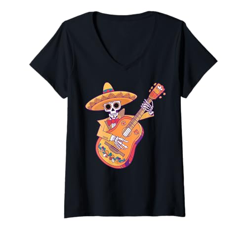 Women's Sombrero Skeleton Guitar V-Neck T-Shirt