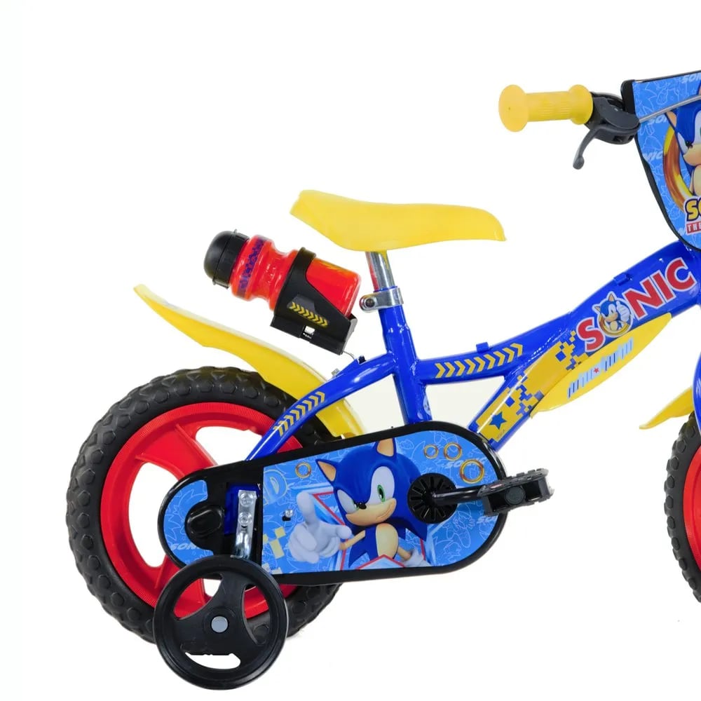 Dino Bikes, 612L-SC Kids Bike Bicycle, Sonic The Hedgehog, 12 inch with training wheel stabilisers and drinks bottle, suits child 3-5 Years, Blue, Yellow, Red