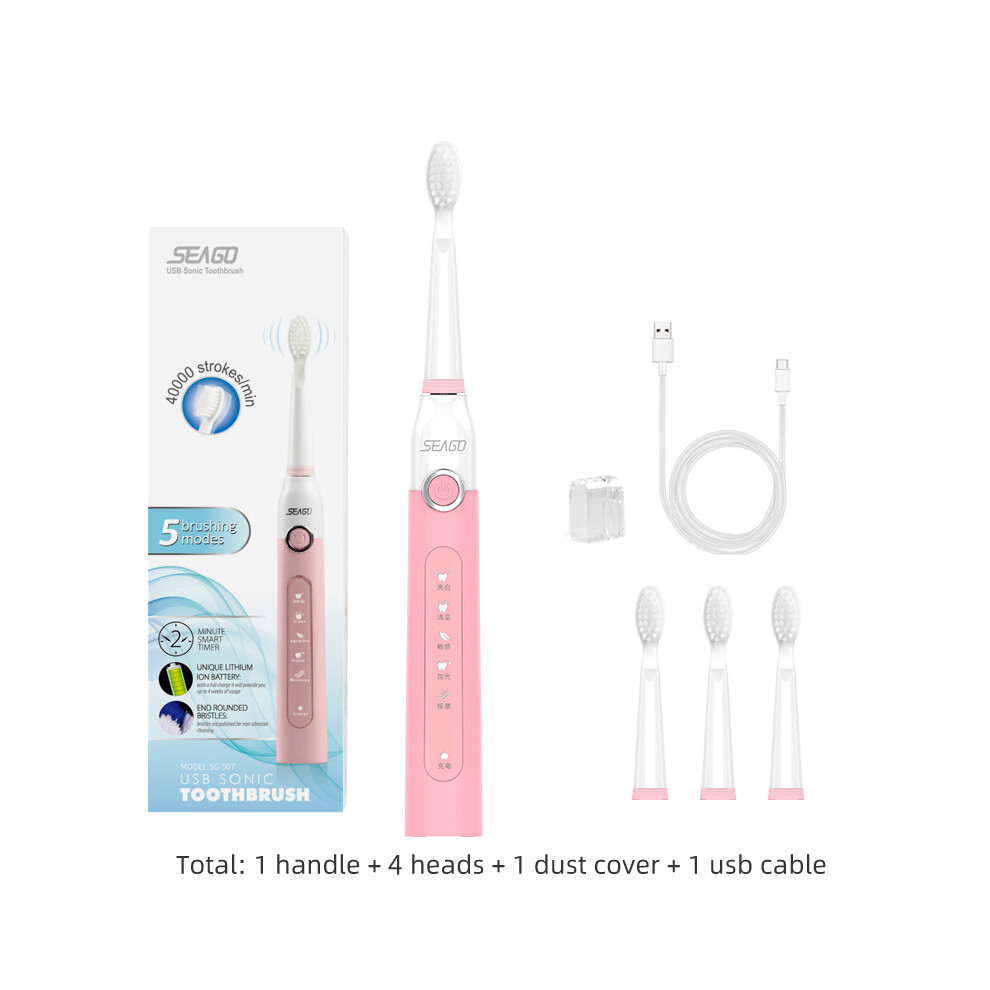 (Pink)SEAGO Electric Toothbrush Rechargeable Sonic Travel Toothbrush Replacement Heads Smart Timer