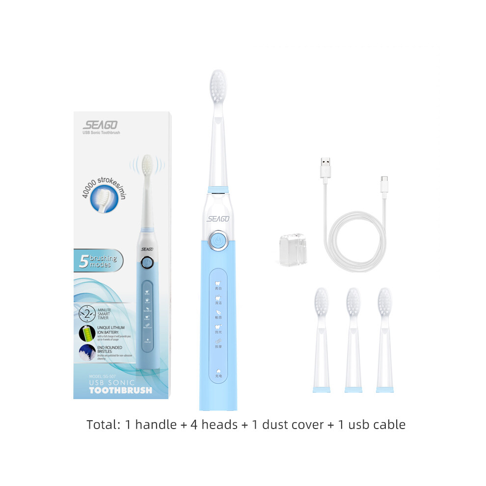 (Blue)SEAGO Electric Toothbrush Rechargeable Sonic Travel Toothbrush Replacement Heads Smart Timer IPX7
