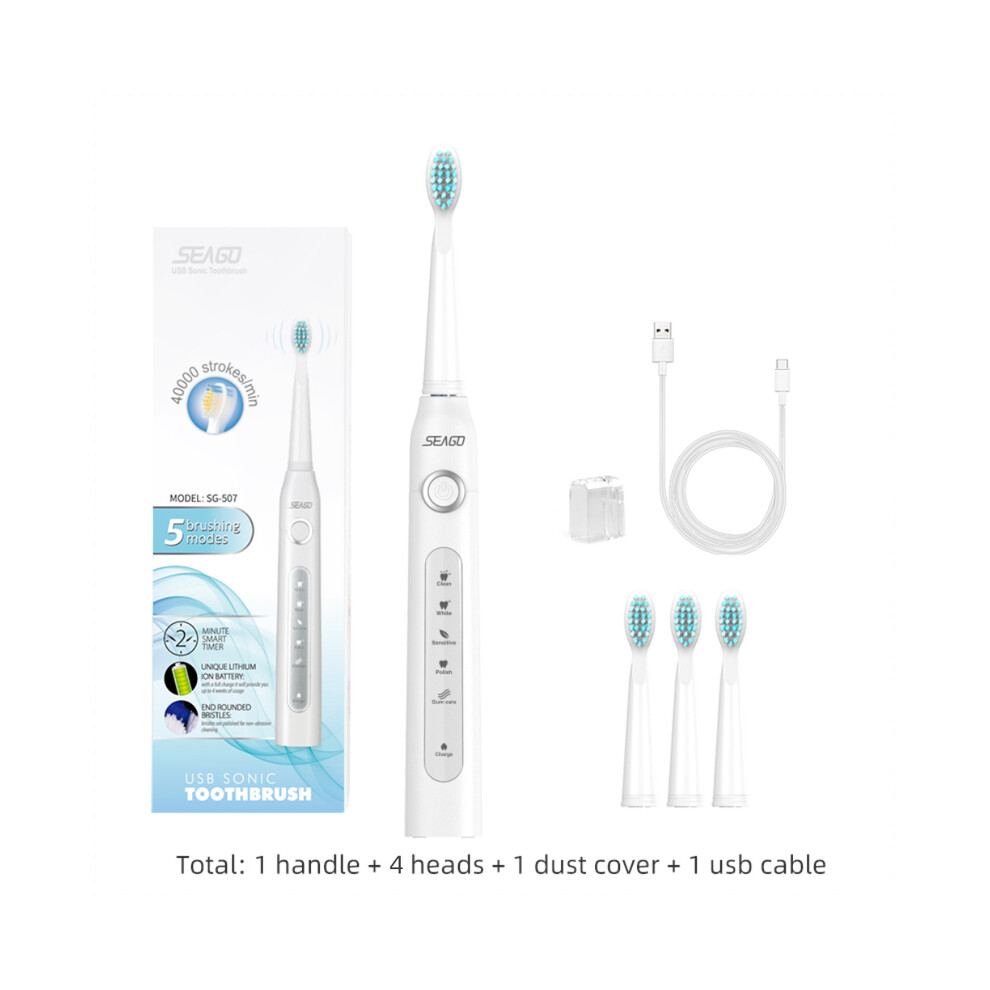 (White)SEAGO Electric Toothbrush Rechargeable Sonic Travel Replacement Toothbrush Heads Smart Timer