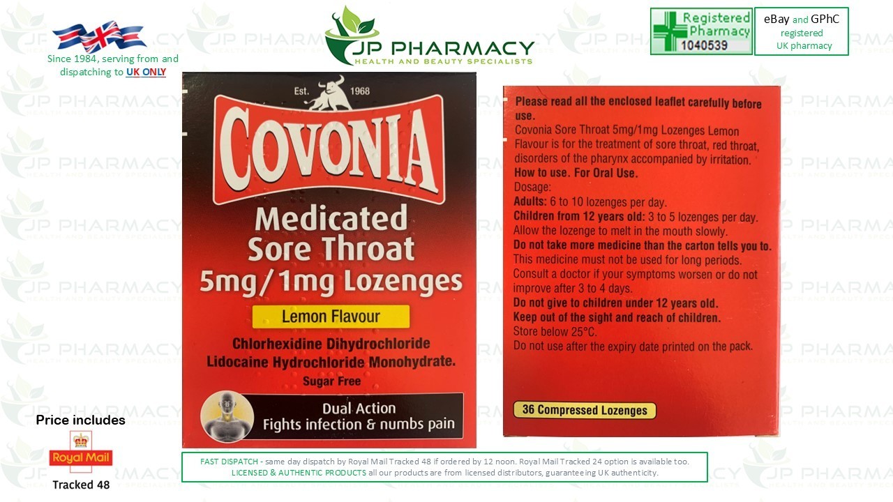 Covonia Medicated Sore Throat 5Mg/1Mg Lozenges Lemon Flavour 36 Lozenges x 2 box