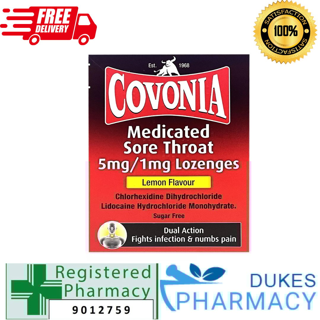 Covonia Medicated Sore Throat lemon lozenges, fights infections & numbs pain.